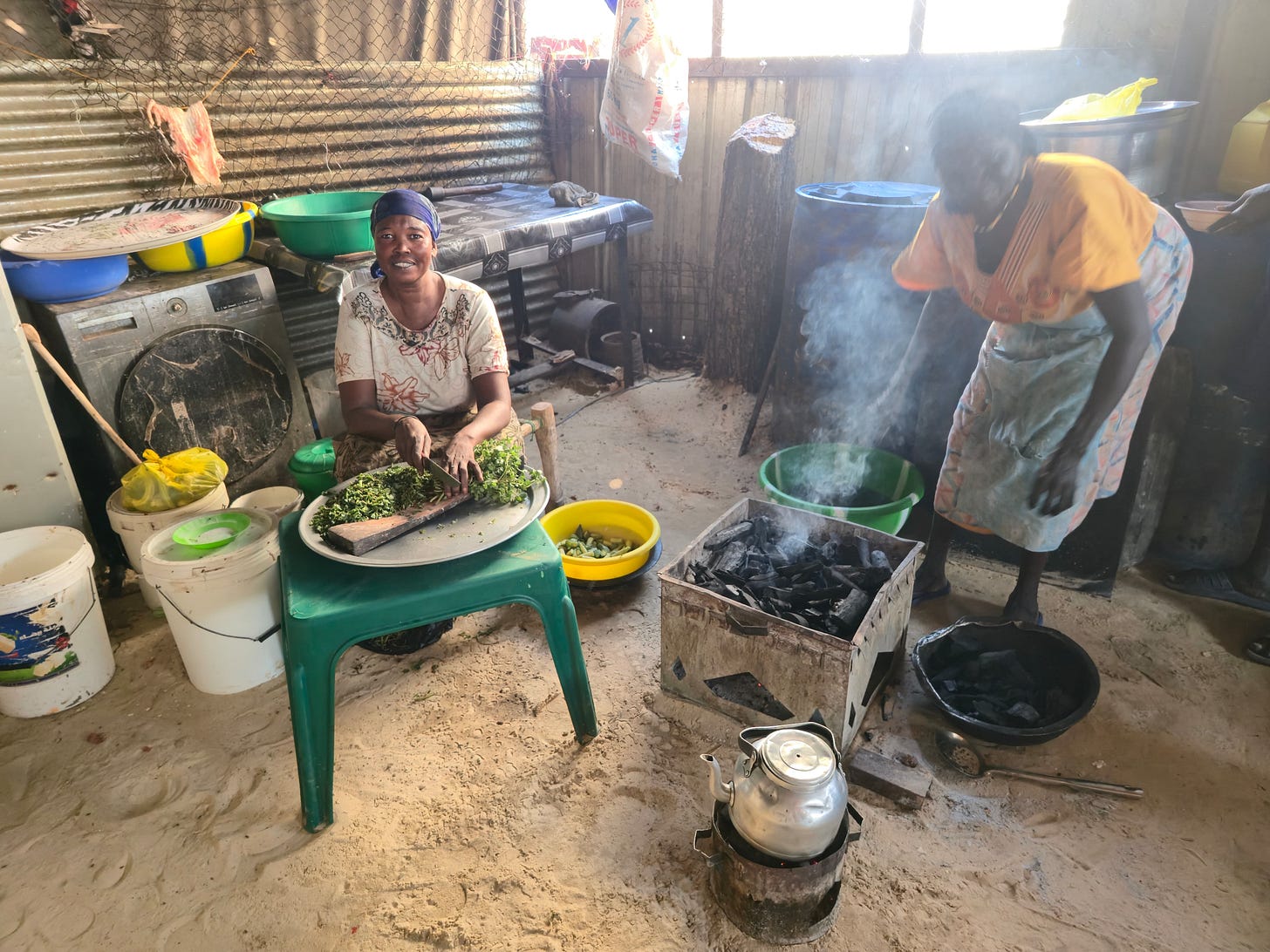Women prepare food over charcoal stoves in small roadside restaurants, chopping greens and boiling water in dented kettles as thick smoke curls toward corrugated metal roofs.