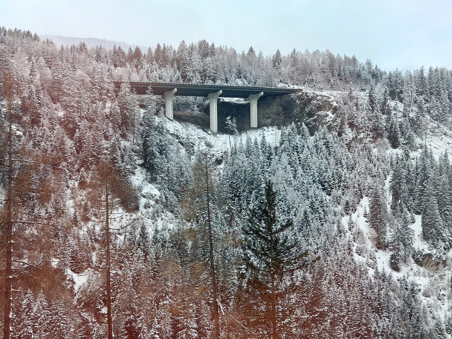 From the train, the landscape unfolds slowly. Snow-dusted trees. A bridge suspended between slopes. Motion without urgency.