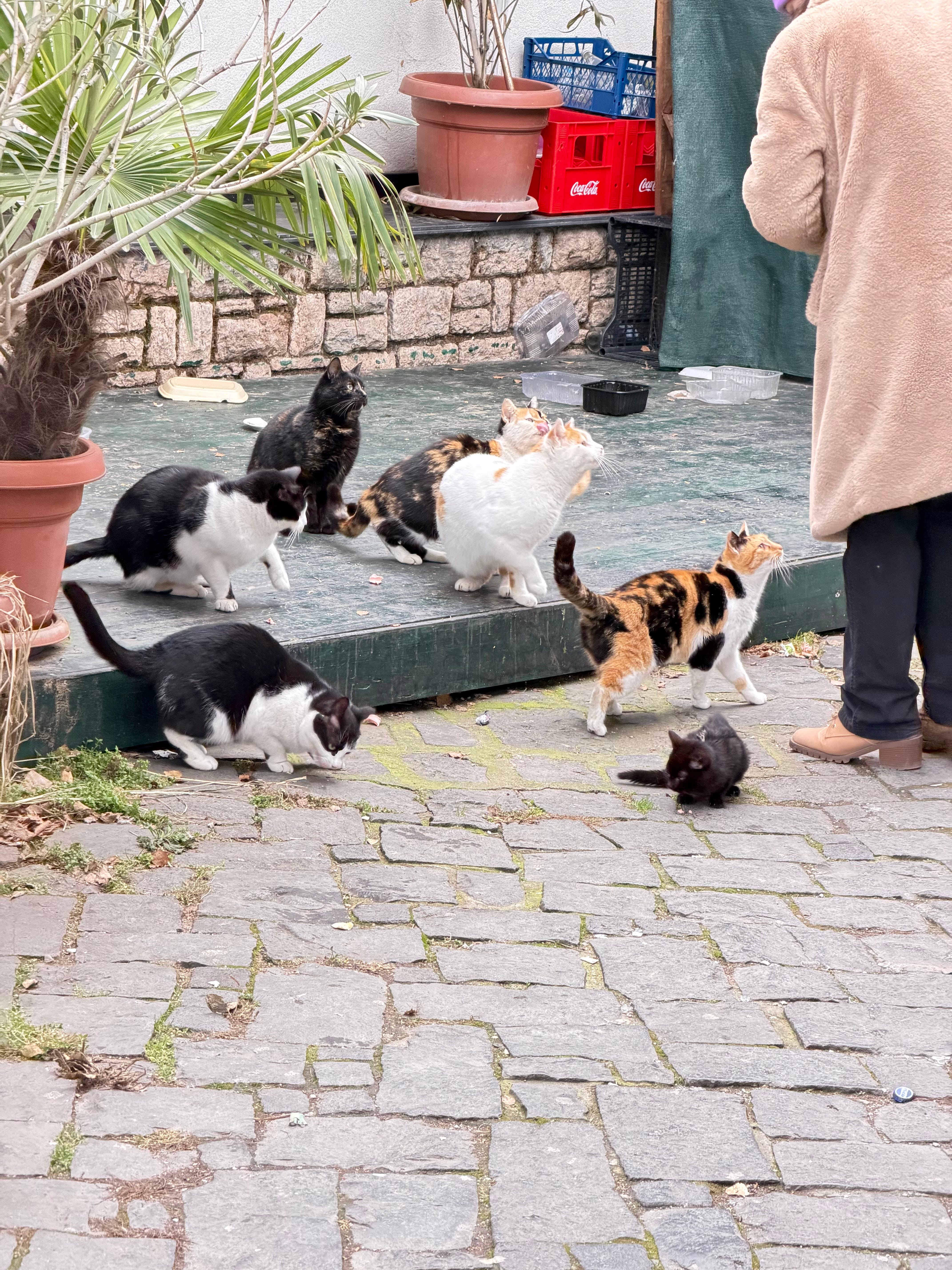 They nap on warm stone steps, patrol café patios, and accept affection like it’s rent. The cats are part of the ecosystem. Respect them. They were here first.